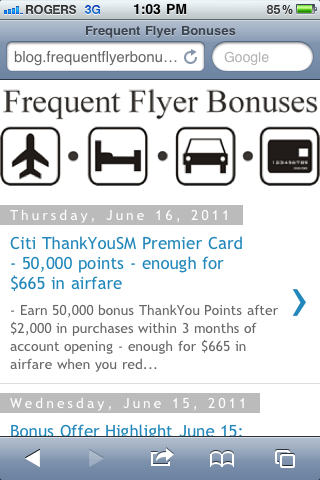 Thanks to the latest enhancement from Blogger, the Frequent Flyer Bonuses blog is now optimized for mobile browsing. There is nothing that you have to do on your end, just point your phone to https://blog.frequentflyerbonuses.com and it will automatically switch to the mobile version.