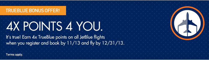 Earn 4x TrueBlue Points on all JetBlue flights when you register and book by November 13 for travel through December 31, 2013. Register Online (Registration is required)
