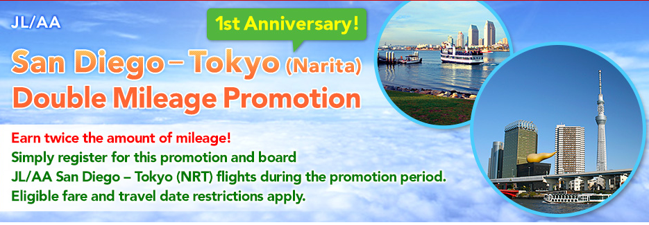 – Double Mileage Bank Miles for Japan Airlines flights between San Diego and Tokyo. More… Dec 1, 13 – Feb 28, 14 Valid for JMB Members in the Americas only