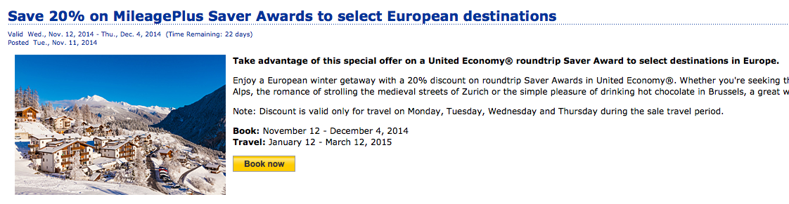Always nice to see discounted award ticket offers, especially to Europe and on an airline that doesn’t add fuel surcharges! With this offer you only need 48,000 MileagePlus Miles for a round trip award ticket between the U.S. or Canada and select cities in Europe. Definitely a good deal if you are looking to travel to Europe from Mid January to Mid March.