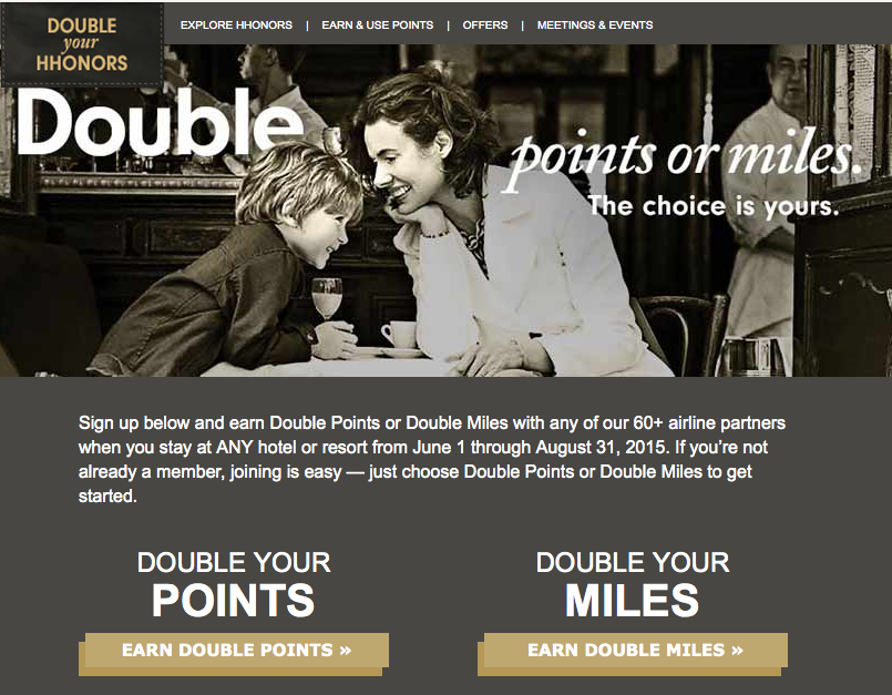 Double HHonors Points or Double Airline Miles for eligible stays at Hilton Hotels & Resorts Worldwide. Full Details, Online Registration and Booking  (Registration is required) Jun 1 – Aug 31, 15