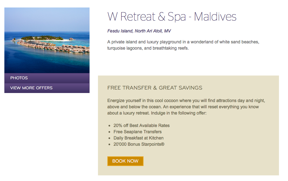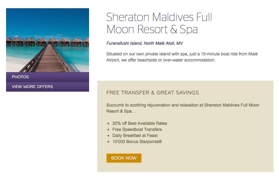 20,000 Bonus Starpoints for stays of 4 or more nights at the W Retreat & Spa – Maldives or 10,000 Bonus Starpoints for stays of 4 or more nights at the Sheraton Maldives Full Moon Resort & Spa. Full details and online booking Until Dec 20, 15