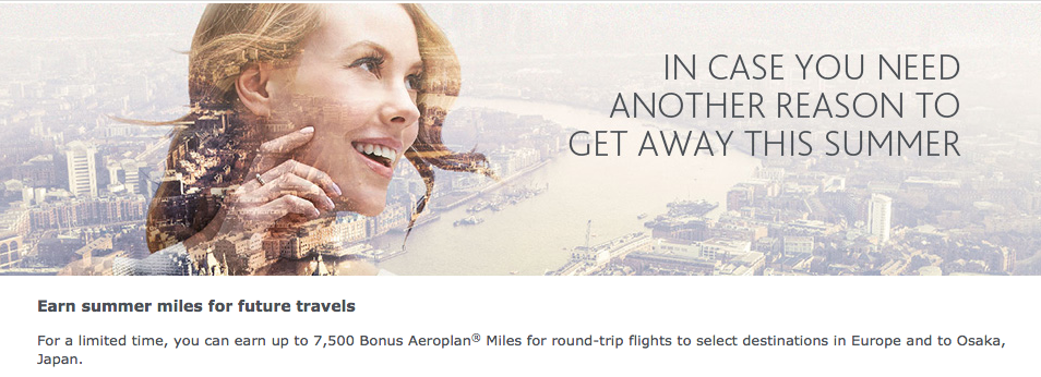 Earn up to 7,500 Bonus Aeroplan Miles for round-trip flights to select destinations in Europe and to Osaka. Book with Air Canada in a Tango, Flex, Latitude or Premium Economy fare, or with Air Canada rougeTM in a Tango, Flex, Latitude or Premium rouge fare. Register Online (Registration is required) Register and book by Jul 31 for travel until Sep 30, 15