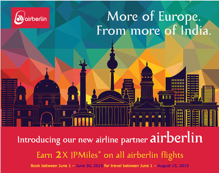 Double JetPrivilege Miles on all eligible airberlin flights Worldwide. Full details Book by Jun 30 for travel until Aug 15, 15