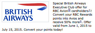– 50% Bonus Avios when you convert RBC Rewards Points (Avion Cardholders only) to British Airways Executive Club. More… Residents of Canada only Until Jul 15, 15