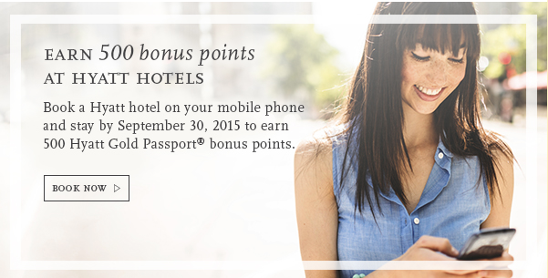500 Bonus Gold Passport Points for all eligible Hyatt stays that are booked via the Hyatt App or Hyatt Mobile Site. Until Sep 30, 15