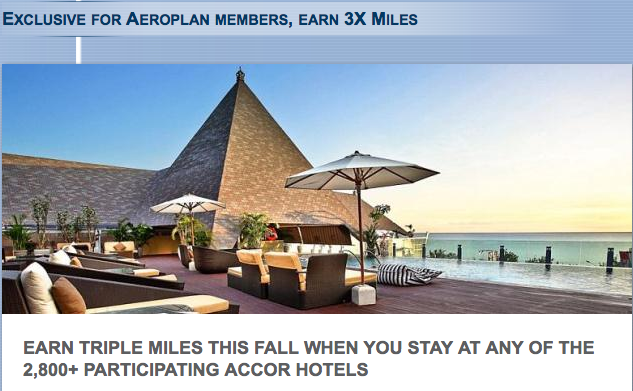 Triple Aeroplan Miles for stays at over 2,800 Accor Hotels Worldwide. Bonus awarded on a maximum of 3 stays. Select automatic conversion to convert your Le Club AccorHotels points into Aeroplan Miles in your Le Club AccorHotels account preferences to take advantage of the bonus. Full