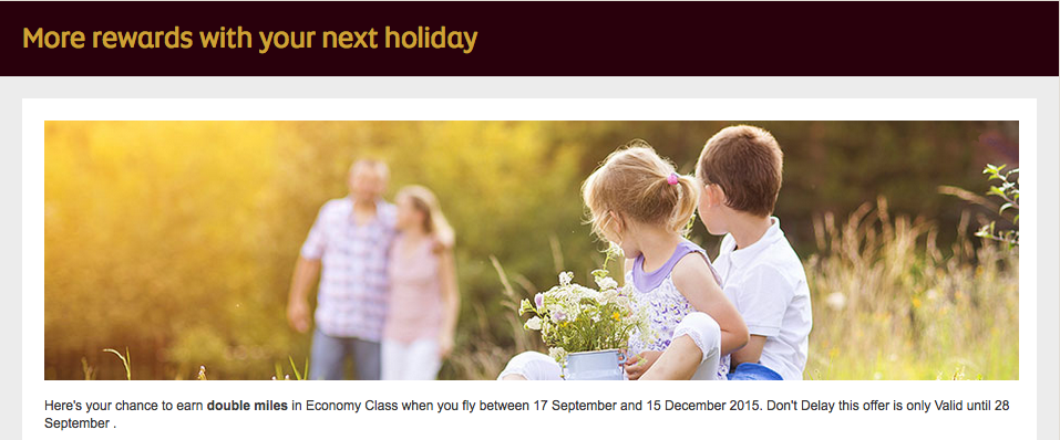 Double Guest Miles on all Etihad flights Worldwide in Economy Class Full details, online registration and booking (Registration is required) Register and book by Sep 28 for travel Sep 25 – Dec 15, 15