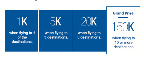 3 desinations, 20,000 Bonus Miles to 5 destinations or 150,000 Bonus