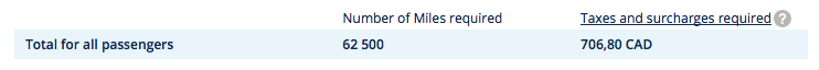 the taxes and fees on the award flight of C$706.80 for a total of