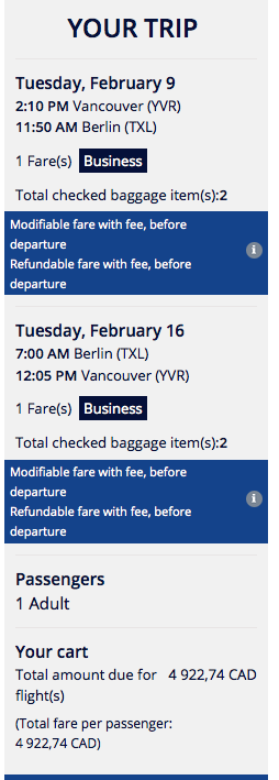 rate between Vancouver & Berlin for 62,500 miles and C$706.80 in taxes and