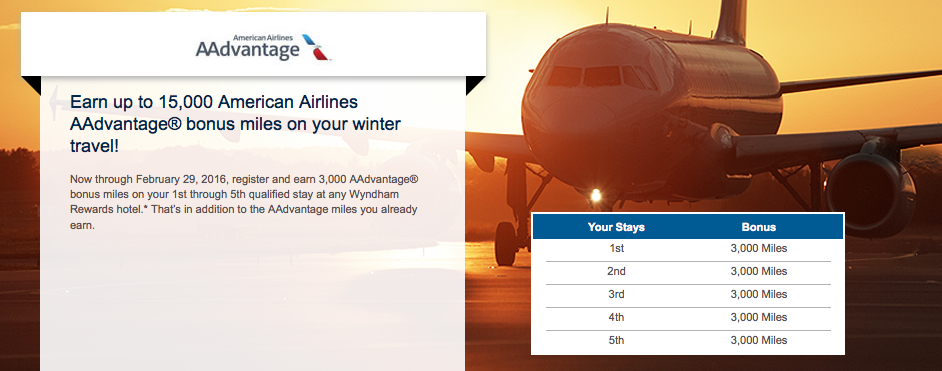 3,000 Bonus AAdvantage Miles per stays at participating Wyndham Hotels Worldwide. Bonus can be earned up to 5 times. Full details, online registration and booking (Registration is required) Until Feb 29, 16