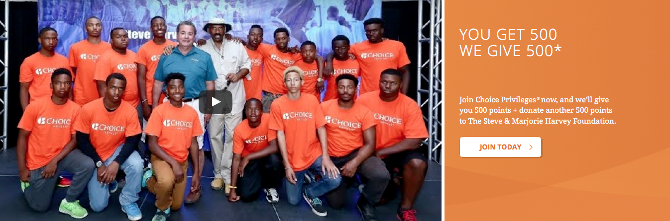 If you join Choice Privileges via the Steve Harvey link you will get 500 points deposited into your account within 72 hours and Choice Hotels will also donate 500 points to The Steve & Marjorie Harvey Foundation.