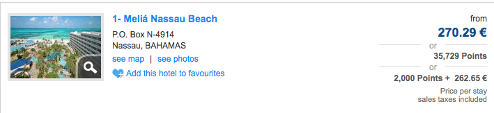 Even with this condition placed on the offer it can be worthwhile as we show in the following example. You can buy 36,000 points for 180EUR and redeem them for a stay in the Bahamas that costs 270EUR or saving you roughly 33% on that night.