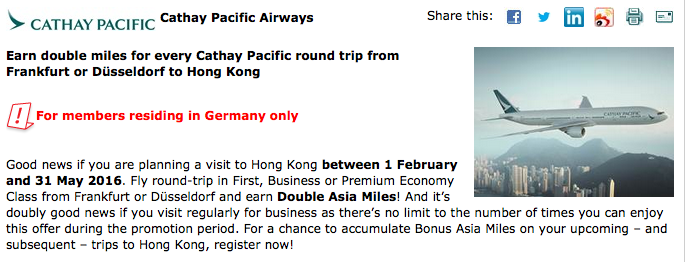 – Double Asia Miles when you fly Cathay Pacific round trip from Frankfurt or Düsseldorf to Hong Kong. More… Valid for residents of Germany only Feb 1 – May 31, 16