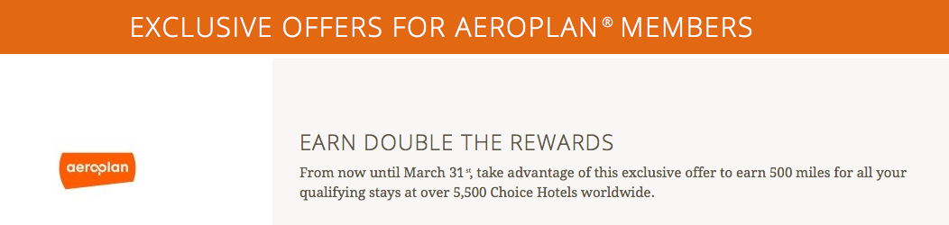Double Aeroplan Miles for stays at over 5,500 Choice Hotels Worldwide. Full details and online booking. Until Mar 31, 16