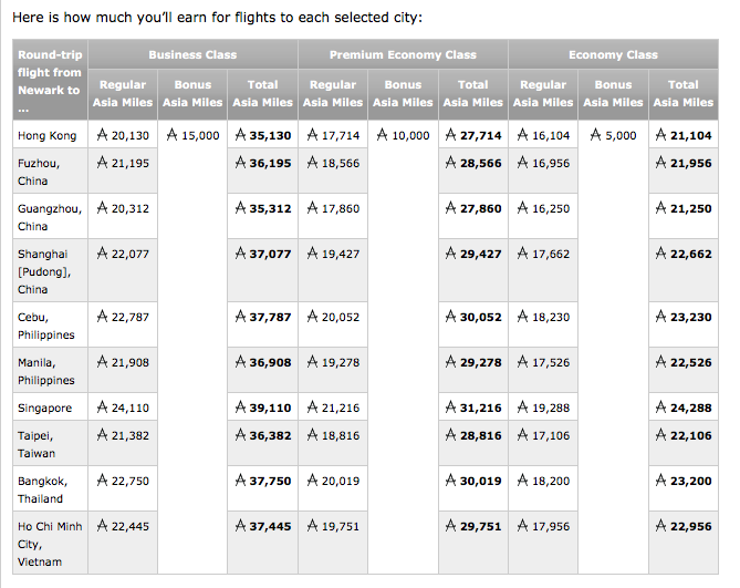 Earn up to 15,000 Bonus Asia Miles when you fly between Newark and Bangkok, Cebu, Fuzhou, Guangzhou, Hong Kong, Ho Chi Minh City, Manila, Shanghai [Pudong], Singapore and Taipei. Earn a bonus of 15,000 Asia Miles in Business, 10,000 Asia Miles in Premium Economy, and 5,000 Asia Miles in Economy Class. Register Online (Registration is required) Until May 31, 16