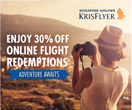 – 30% KrisFlyer Miles Discount on Singapore Airlnes Economy Saver award tickets for travel on many flights Worldwide. More… Book by Feb 14 for travel until Feb 15 – May 26, 16