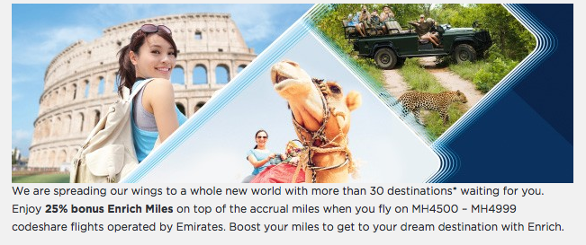 25% Bonus Enrich Miles when you fly on MH4500 – MH4999 codeshare flights operated by Emirates. Full details Until Apr 19, 16