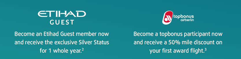 free miles. But seeing that Etihad Guest is a major player with airberlin they have been tossed into the mix and now you can choose from 1,000 free Etihad Guest or airberlin top bonus miles and if you aren’t an Etihad Guest member yet they’ll give you Silver Elite Status for a year when you complete your first Etihad flight (open to the first 1,000 people who register) or if you aren’t an airberlin top bonus member you can get a 50% discount on your first award flight. The 50% discount is awarded as miles returned to your account after you redeem. With awards starting at only 3,000 miles you’ll be half way there with this offer and airberlin’s 500 miles just for signing up for topbonus.