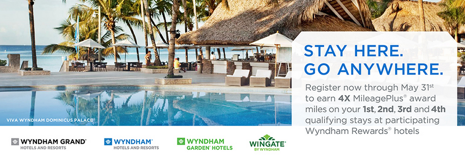 Quadruple MileagePlus Miles for stays at a participating Wyndham Hotels and Resorts, Wyndham Garden or Wingate by Wyndham hotel. Bonus can be earn on the first to fourth stays within the promotional period. Full details, online registration and booking (Registration is required) Until May 31, 16