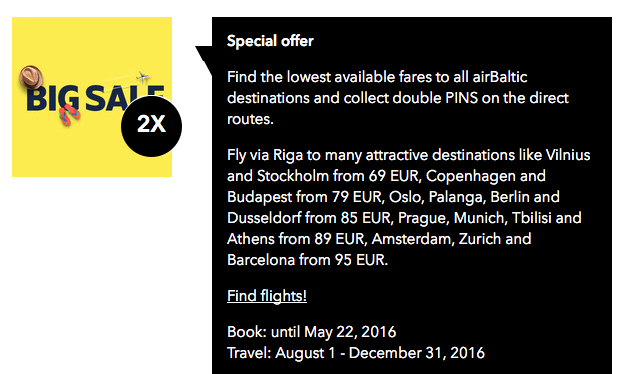 Double PINS on all airBaltic flights systemwide. Book online at airBatlic. Book by May 22 for travel Aug 1 – Dec 31, 16