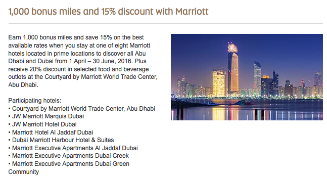 – 1,000 Bonus Guest Miles for stays at Marriott Hotels in Abu Dhabi and Dubai. More… Until Jun 30, 16