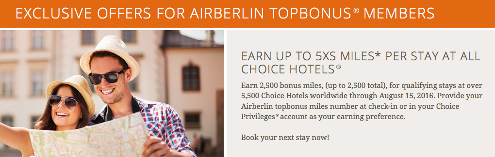 Earn up to 5x topbonus Miles for stays at over 5,500 Choice Hotels Worldwide. Full details and online booking. Until Aug 15, 16