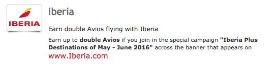 Double Avios when you fly Iberia on select routes Worldwide. Full details, online registration and booking (Registration is required) Register by May 12 for travel until Jun 30, 16