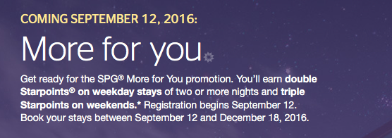 Starwood Preferred Guest has revealed the details of their next systemwide promotion called More for you. The promotion will offer double Starpoints for stays of two or more nights on weekdays and triple Starpoints for stays of three or more nights on weekends. What we don’t know yet is whether all Starwood locations will be participating as we see in some of their promotions or if their will be properties that choose not to participate. Registration for the promotion starts on September 12th and all your eligible stays between September 12 and December 18 will count towards the promotion. So you can start booking now at SPG.com.