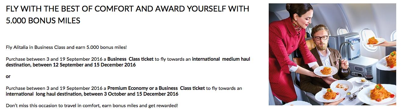 – 5,000 Bonus MilleMiglia Miles when you fly on Alitalia medium or long haul flights in Premium Economy or Business Class. More… Book by Sep 19 for travel Sep 12 – Dec 15, 16