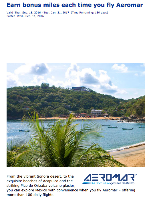Earn up to 500 Bonus MileagePlus Miles when you fly on Aeromar within Mexico or between the U.S. and Mexico. Register online (Registration is required) Until Jan 31, 17