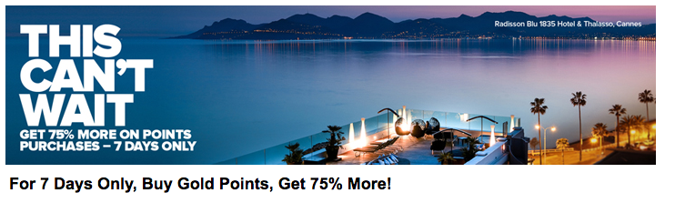 Club Carlson launched a week long buy points bonus that sees points purchases receive a bonus of 75%. That means you can buy points for around 0.4 cents each. This isn’t bad but can be better as we have seen a 100% bonus in the past although it is rare. This may be the time to top up your account for a redemption.