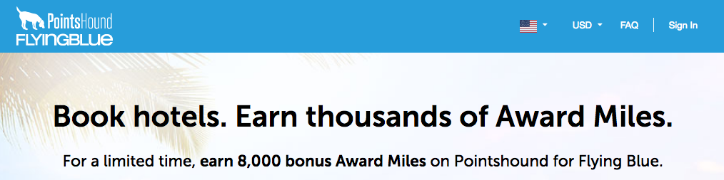 8,000 Bonus Flying Blue Miles on your first hotel booking of 2 or more nights made via PointsHound. Full details. Book by Nov 30, 16