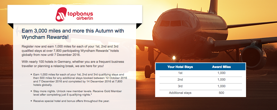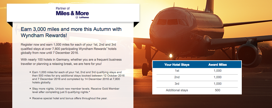 1,000 Bonus Miles&More Miles per stay at over 7,800 participating Wyndham Rewards hotels globally.. Bonus awarded on your 1st, 2nd & 3rd stays Full details, online registration and booking. (Registration is required) Register & book by Dec 7 for stays until Dec 14, 16