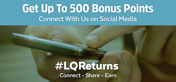 Earn up to 500 Free La Quinta Returns Points when you connect with La Quinta on several social media channels. Full details Until Dec 31, 16