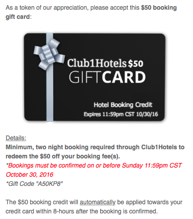 “As a token of appreciation for current members Club1Hotels are giving members $50 off their booking fees on any bookings made before Sunday at midnight. (This includes new members too who make a booking)”