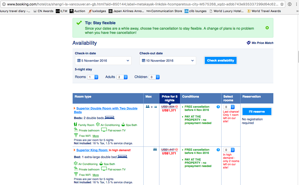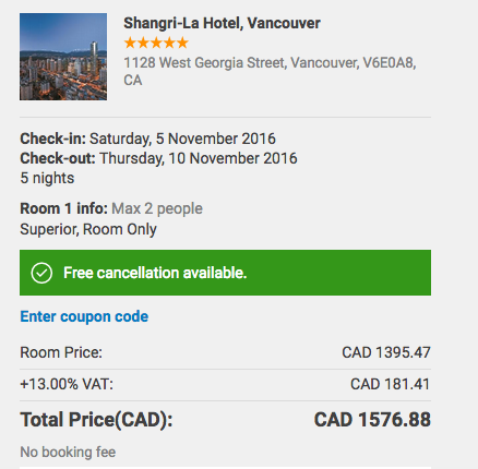 We looked at the Shangri-La in Vancouver for stays November 5th to 10th and these are the results: