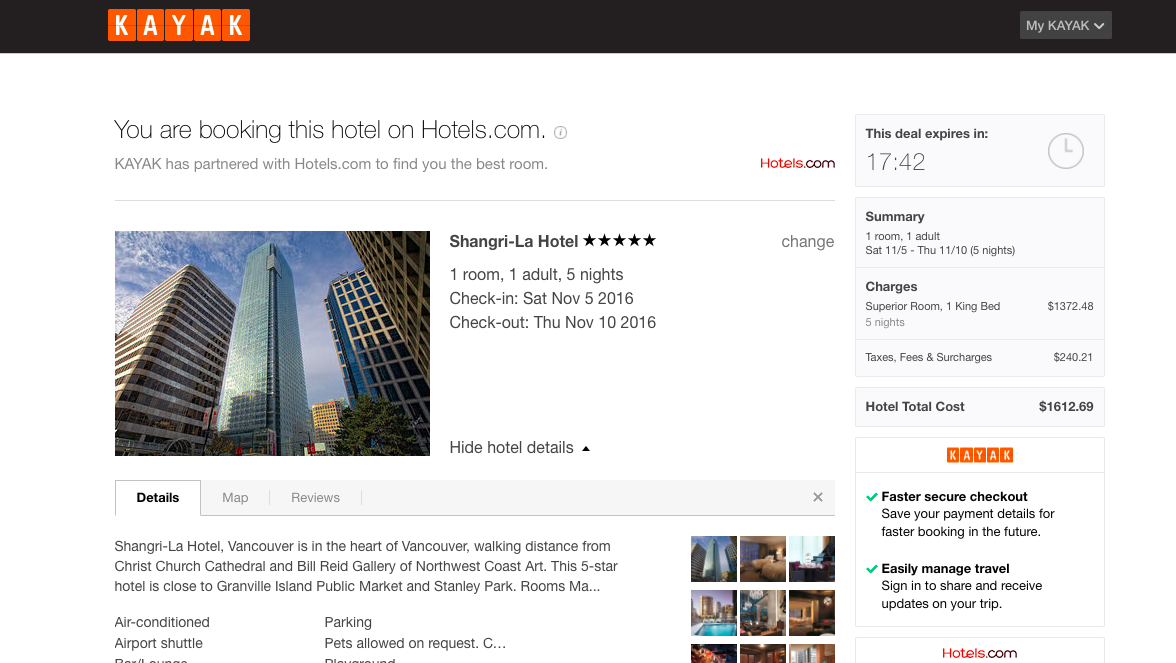 Kayak.com (linking to hotels.com) US$1,612.69