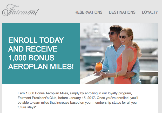 1,000 FREE Aeroplan Miles when you join Fairmont Hotels President’s Club. Enroll here (enrollment code is embedded). Until Jan 15, 17
