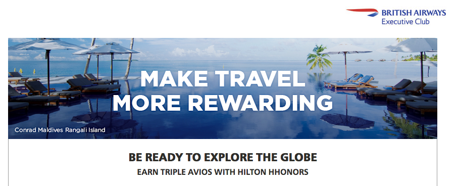 | British Airways Executive Club | Triple Avios on all eligible stays at Hilton Hotels Worldwide Full details, online registration and booking (Registration is required) | Until Dec 31, 16 | ||||||