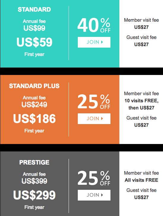 the lounges at no extra cost. All three memberships allow for guests to