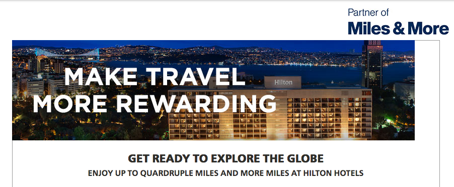 Earn up to Quadruple Miles & More Miles for stays at participating Hilton hotels Worldwide. Full details, online registration and booking (Registration is required) Feb 1 – Apr 30, 17
