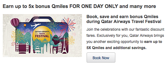 Planning travel on Qatar Airways? Today is the day to book if you can! You’ll earn 5x QMiles with Qatar Airways Travel Festival and if you follow other blogs you’ll see there are some amazing Business Class fares right now between the U.S. and Singapore. After today the bonus drops to a tiered bonus of 3x to 4x miles depending on the class of ticket you buy.