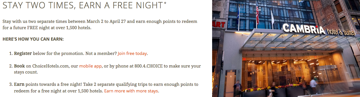 Choice Hotels has revealed the details of their Spring promotion and it is pretty much the same one they ran up until last Fall when they decided to switch to double points on all stays! That being said,