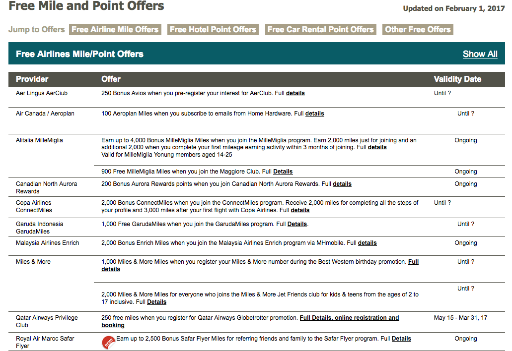 FFB Free Mile and Point Offers (http://www.frequentflyerbonuses.com/freemiles.html)