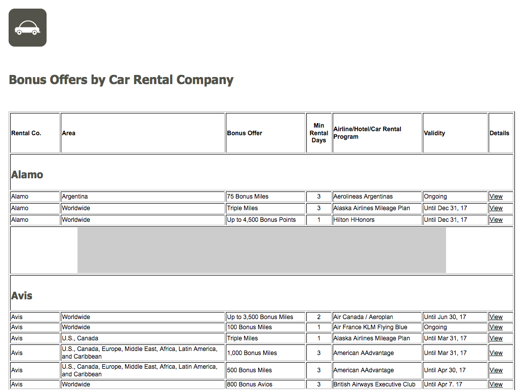FFB Car Rental Bonus Offer Listing (http://www.frequentflyerbonuses.com/carbonus.html)