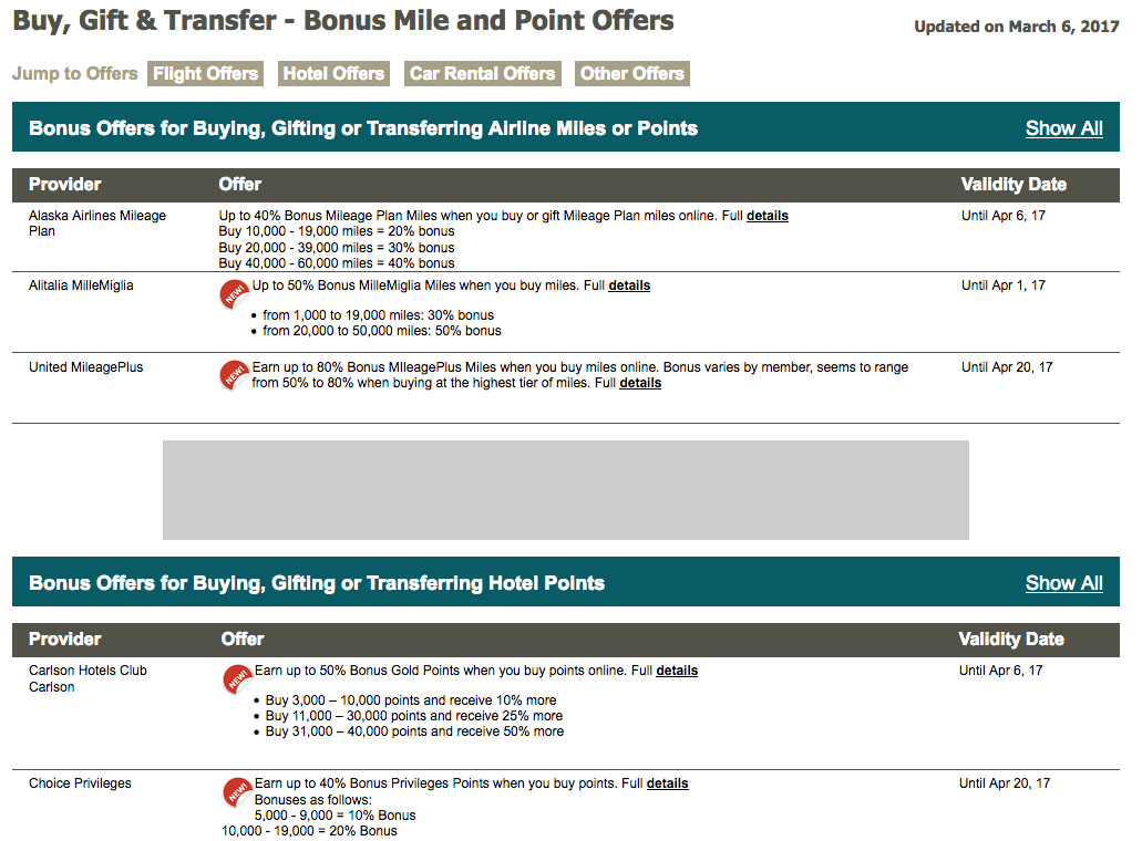 FFB Buy, Gift, Transfer Mile and Point Bonus Opportunities (http://www.frequentflyerbonuses.com/buymilesoffers.html)
