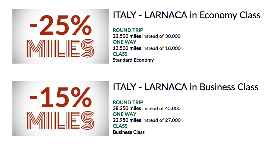 Up to a 25% MilleMiglia Miles Discount for award redemption between Italy and Larnaca. Full details. Book by Apr 27 for travel May 1 – Jun 30, 17