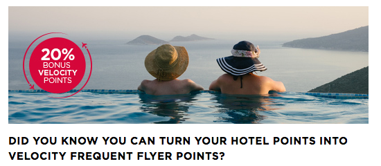 20% Bonus Velocity Points when you convert hotel rewards points to Velocity Rewards points. Full details Until Jun 30, 17